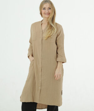 Copen skjorten fra Masala er en super skøn lang skjorte med en rummelig pasform og slidser i siden. Skjorten kan bruges lukket som kjole eller åbentstående evt sammen med bukser.